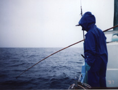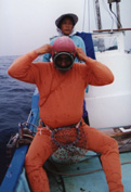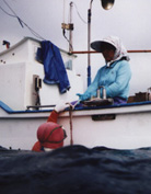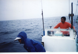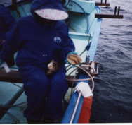 | 船で漁場に到着。 いつも奥さんと一緒です。 |
