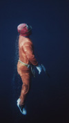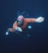 | 分銅につかまり一気に海底へ | 素早くアワビを探します。 | アワビをつかんで水面へ | 急上昇中 |