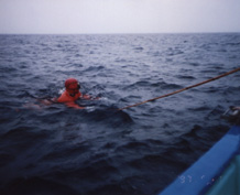 | 潜っている間,奥さんは上で待ちます。 | 持っていた竹の棒で船縁まで引っ張ります。 |