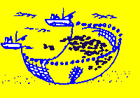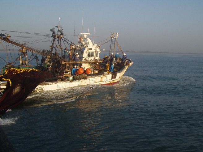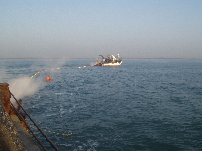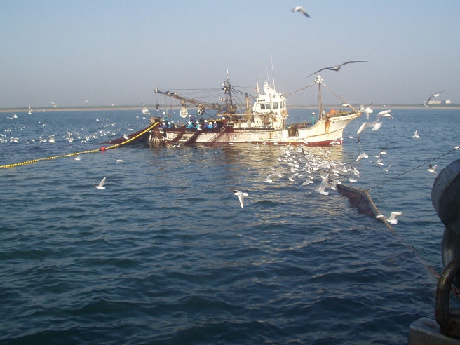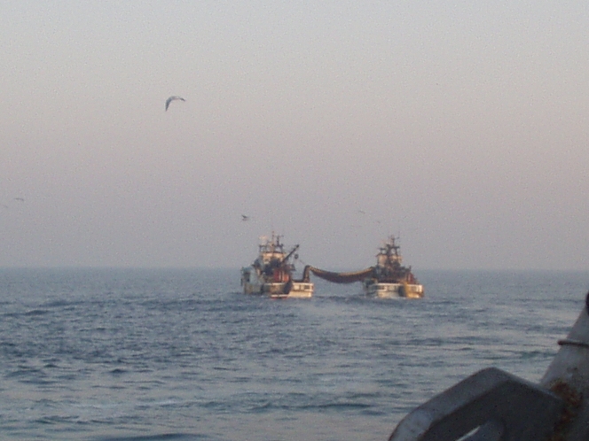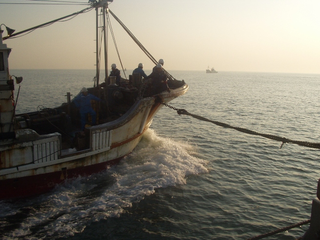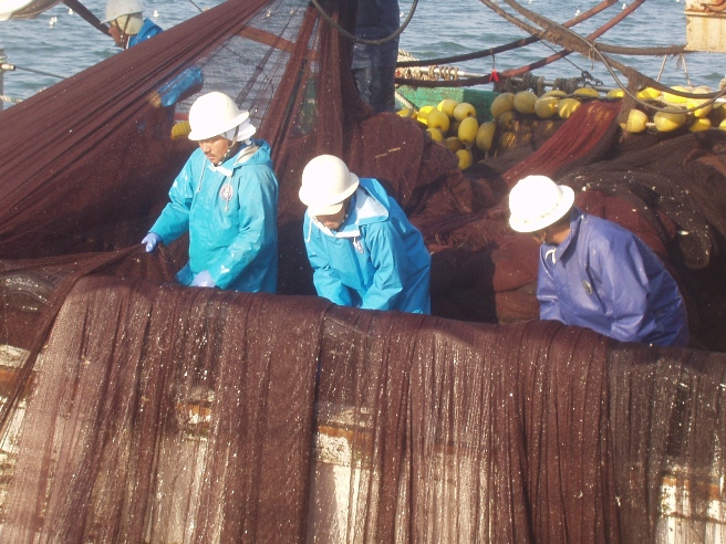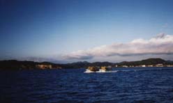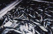まき網漁業内湾〜銚子・九十九里魚群探知機やソナーを駆使して魚の群れを見つけ,網で群れごと巻いて獲るのが まき網漁業です。2そう巻きと1そう巻きがありますが、このページでは2そう巻き網漁船の操業を紹介します。 2そう巻き網とは2隻同じ大きさの船が網を持ち,魚群をみつけると左右からとりかこむように網を入れて獲ります。網を広げる時以外は,出港から入港まで2隻はピッタリ引っ付いて走ります。この船が「網船」,このほかに魚群を探す「魚探船」,魚を運ぶ「運搬船」で全部で5〜6隻程度で運行します。 |