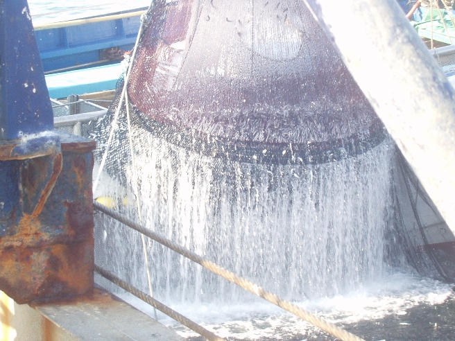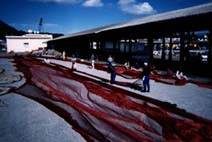 | 帰港は真夜中 水揚げが朝までかかることもある。 | 水揚げされたアジ 15年くらいやってるが,魚価が上がらないことが不満。 | 網の整備 |