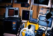 | 夕方出港,いつも夕焼けを見ながら操業している。晩ご飯は船で。刺し身や煮付けがおかず。写真は網船 | 喜平治丸の操舵室 様々な機材が並ぶ | 漁場は東京湾から外房までイサキ,アジ,タチウオを漁獲する 昨年10月に体長3mのマンタが網に入ったことがある |