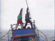 海上でカジキを探しているところ 船の先端にいるのが「突き手」,柱の上のかごの中にいるのが「操船係」 |