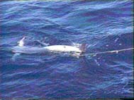 銛にはひもが突いていて,当たればひもをたぐります。右はたぐられたカジキ |