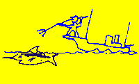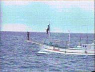 夏場になると、三陸沖のカジキを狙いに房州船が1−2ヶ月間行っていました。最近はカジキが少なくなり遠出することもなくなりました。 千葉県の一本釣り漁船には,先端が細長くのびているものが多くみられます。これはカジキの突棒をおこなうためです。ねらうは高価なマカジキ。カジキの漁場は黒潮のへり,潮目です。遠くて港から60〜70マイル三宅島のあたりまで。水温の目安は18℃ぐらい。カジキはサンマを追いかけて来るので,鳥群れを探します。 カジキはイラストのように水面に背鰭(せびれ)もしくは尾鰭を出して泳ぎます。これを見つけて,漁師は船の先端に身をのりだして銛(もり)でカジキを一突きにします。的中率は良くて5割,水深2mぐらいまで銛を打つけど,深いとはずす率は高い。 |