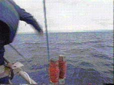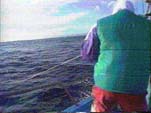 カジキを突こうとしているところこの船は3人乗りなので突き手が2人います。 |